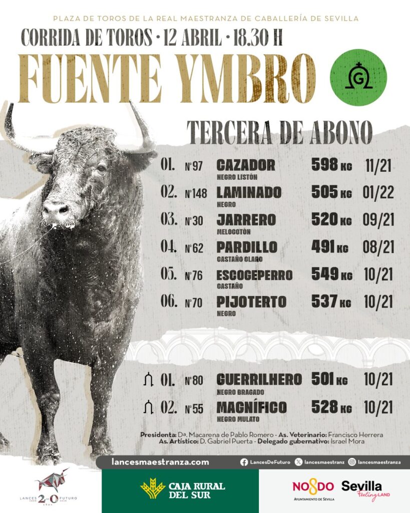 La Plaza de Toros de la Real Maestranza de Caballería de Sevilla acoge este 12 de abril a las 18:30 horas una de las citas más esperadas del abono: la corrida de Fuente Ymbro, un hierro que regresa con un encierro serio, imponente y con el trapío que exige la categoría de Sevilla.