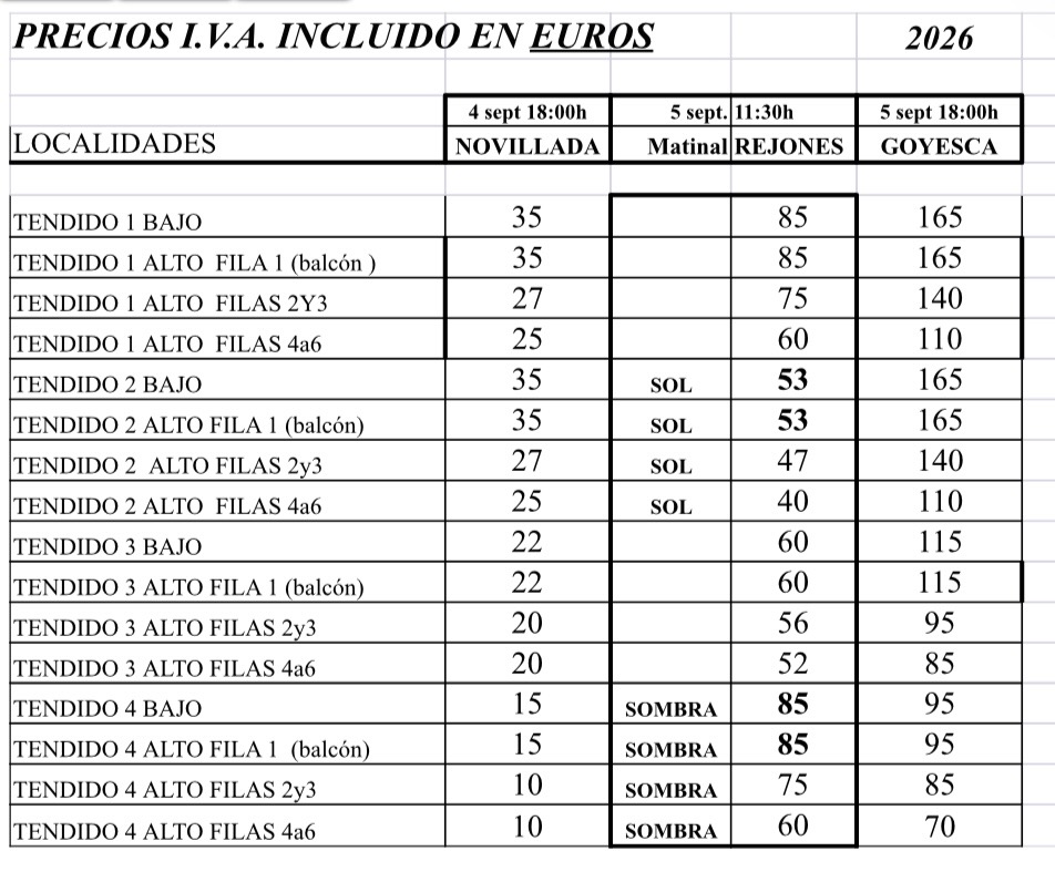 La compra de abonos seguirá estando disponible hasta mañana en la misma web de venta de entradas. Los precios de las entradas van desde los 10€ para la novillada a los 165€ para la goyesca